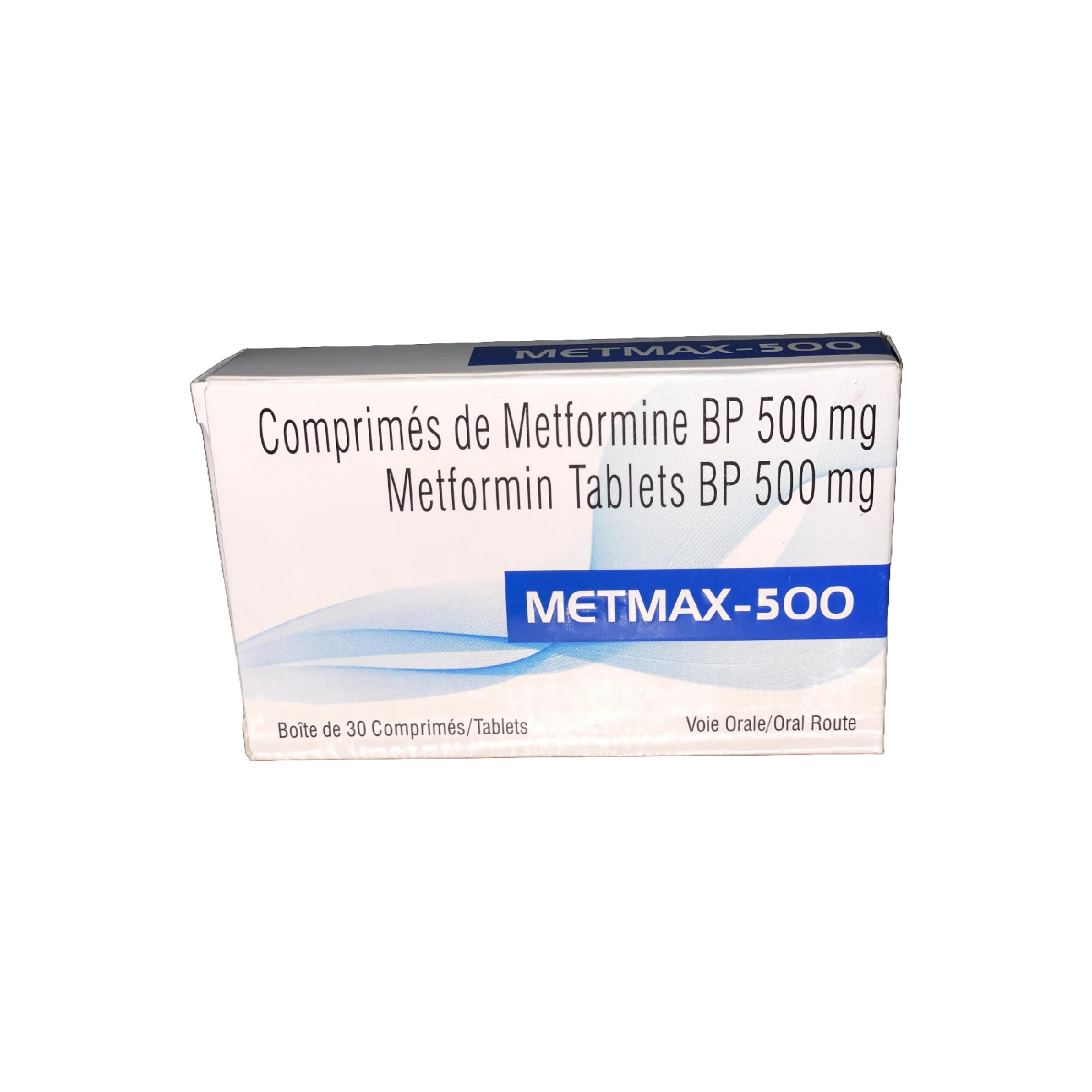 Metmax® 500 mg est un antidiabétique oral contenant de la metformine. Chaque comprimé contient 500 mg de metformine, qui est un agent hypoglycémiant de la classe des biguanides. Ce médicament est prescrit pour le traitement du diabète de type 2, en particulier chez les patients en surpoids, lorsque le régime alimentaire et l’exercice ne suffisent pas à contrôler leur glycémie.